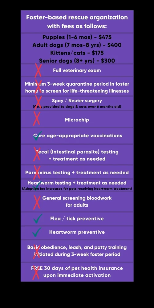 Not all rescue organizations are created equal, and it is important to understand the benefits with each adoption. The charts below can help you understand what’s included with your adoption fee at WTAR compared to other pet rescue organizations in the DMV area*